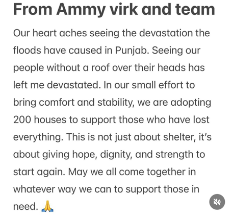 After hearing the news of the devastating floods in Punjab, many influential figures came up to pray for Punjab and offer support. Shubham Gill, widely known Indian cricketer shared on his Instagram story- “Heartbroken to see my Punjab devastated by floods. Punjab will always be stronger than any adversity, and we’ll rise up from this. My prayers are with all affected families. Standing strong with my people.” Further, the entertainment industry stars have come up to support and provide relief to the affected areas. Ammy Virk, renowned actor and singer announced on his Instagram post his support for adopting 200 houses who have been massively affected by the rains, He shared-